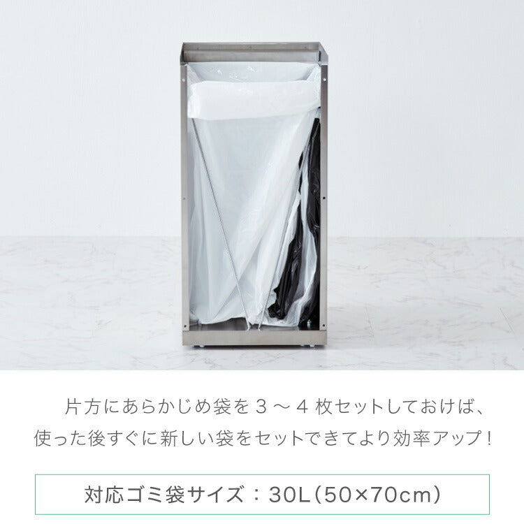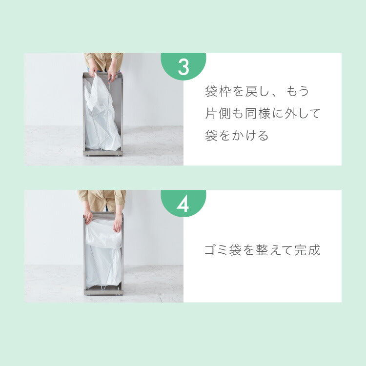 袋枠にはマグネットが付いており、ゴミ袋をしっかり固定できるため、袋のずれや外れを防ぎます。30L(50×70cm)のゴミ袋に対応し、袋のセットもスムーズ。